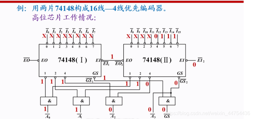 观察可得,左边EI为1,所以说左边芯片不工作,观察74148功能表可得,左边芯片输出全为1,所以A’也为1,以此类推,有兴趣的读者可以自行研究一下。