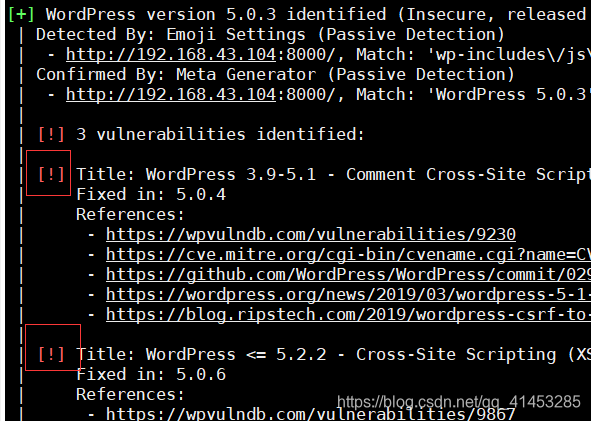 - 它会扫描给定的WordPress站点的一些信息,并且列出可能是漏洞的地方。注意,这里wpscan判断是否有漏洞,是根据wordpress的版本判定的,只要你的版本低于存在漏洞的版本,那么,它就认为存在漏洞,所以,这个没有太多的参考性