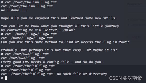 分别cat /home/flag4/flag4.txt 、/var/www/flag1.txt、/root/thefinlflag.txt