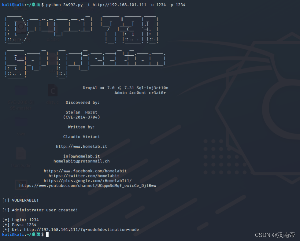 CVE2014-3704脚本下载链接:Drupal 7.0 < 7.31 - 'Drupalgeddon' SQL Injection (Add Admin User) - PHP webapps Exploit,使用的版本drupal:7.0-7.31
