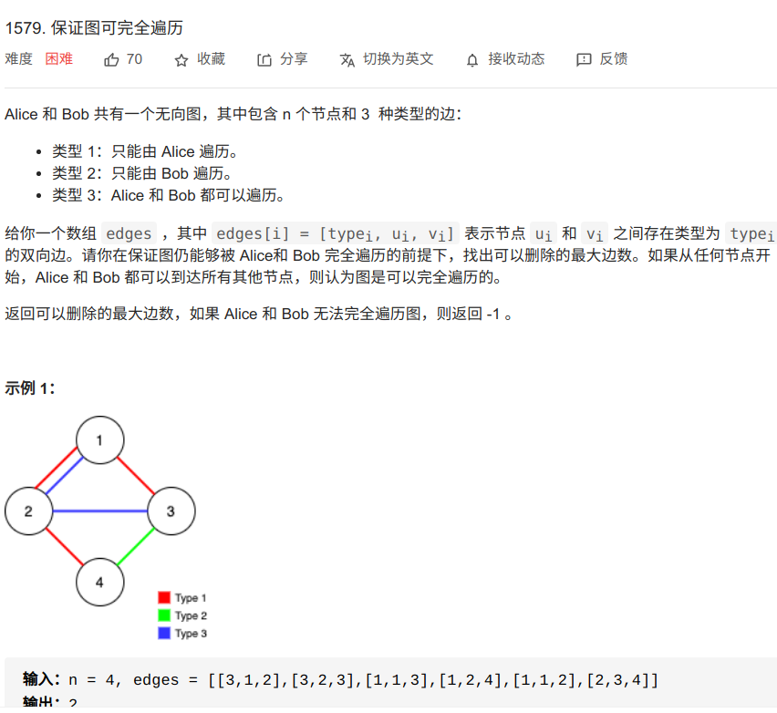 public:int maxNumEdgesToRemove(int n, vector<vector<int>>& edges) {for (auto &edge : edges) {--edge[1];--edge[2];}int ans = 0;UnionSet us(n);// UnionSet us_a(n);// UnionSet us_b(n);for (auto &edge : edges) {if (edge[0] == 3) {//遍历公共边if (us.unite(edge[1], edge[2])) {// us_b.unite(edge[1], edge[2]);} else {++ans;}}}//计算Alice的联通UnionSet us_a;us_a.n = n;us_a.father = us.father;us_a.setCount = us.setCount;us_a.size = us.size;for (auto &edge : edges) {if (edge[0] == 1) {if (us_a.unite(edge[1], edge[2])) {} else {++ans;}}}if (us_a.setCount != 1) {return -1;}//计算Bob的联通UnionSet us_b;us_b.n = n;us_b.father = us.father;us_b.setCount = us.setCount;us_b.size = us.size;for (auto &edge : edges) {if (edge[0] == 2) {if (us_b.unite(edge[1], edge[2])) {} else {++ans;}}}if (us_b.setCount != 1) {return -1;}return ans;}