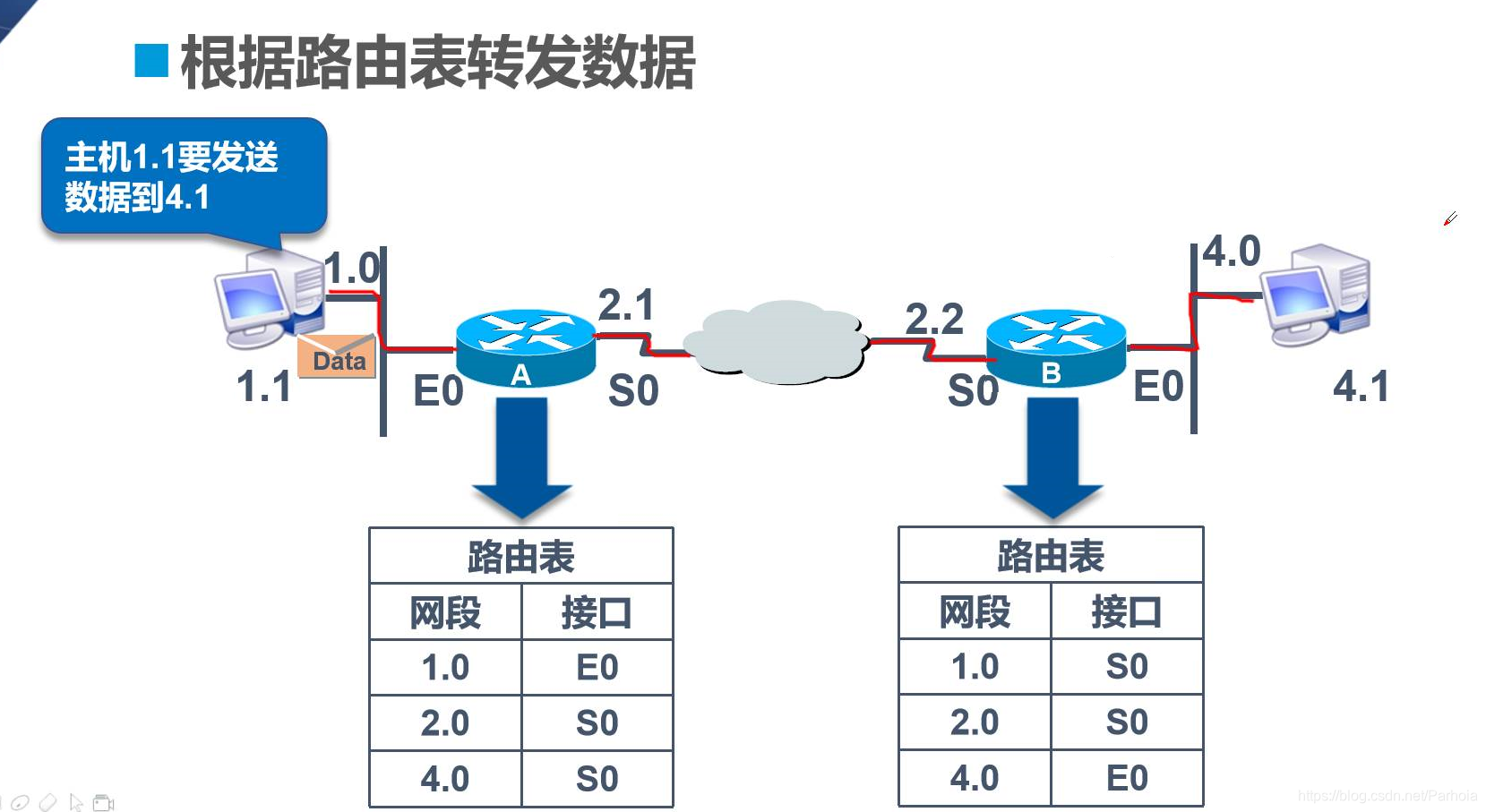 2)路由器A 接收到数据包,先查看数据包IP首部中的目标IP地址。再查找自己的路由表。数据包的目标IP地址是4.1.属于4.0网段,路由器A 在路由表中查到4.0网段转发的接口是S0接口,于是路由器A将数据从S0接口转发出去。