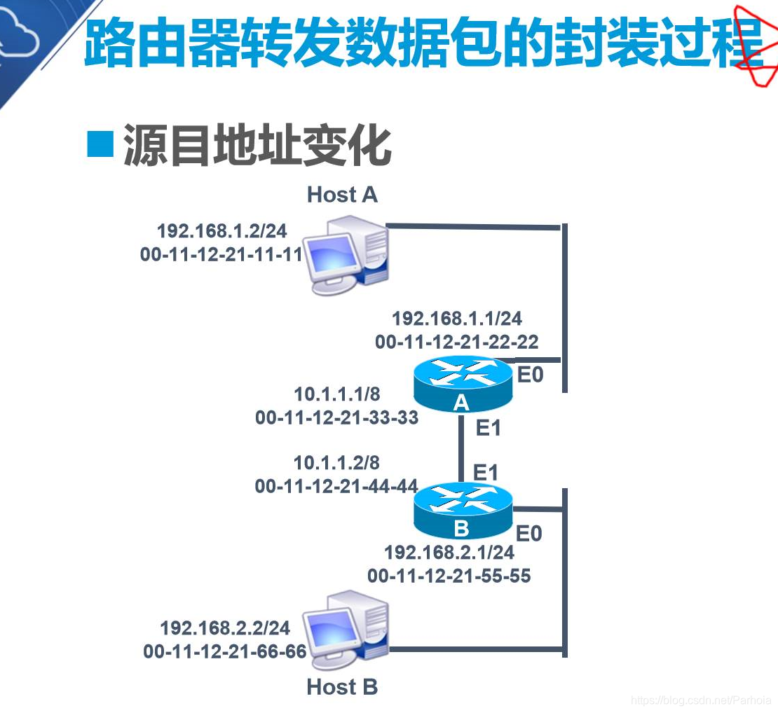 1)HostA在网络层将上层的报文封装成IP数据包,其首部包含源地址和目的地址。源地址即本机IP地址192.168.1.2,目的地在为HostB的IP地址192.168.2.2,HostA使用本机配置的24位掩码于目的地址进行“与”运算,得出目的地在与本机地址不在同一网段,因此发往HostB的数据包需要经过网关路由器A转发。