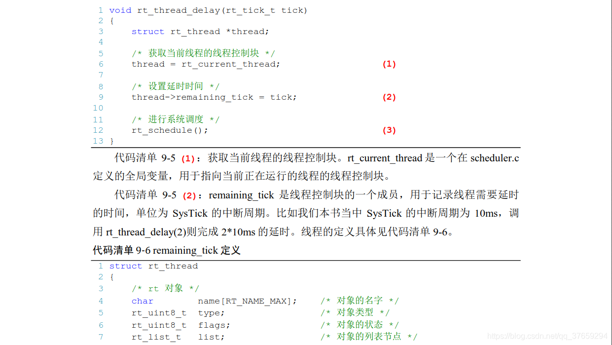 阻塞延时的阻塞是指线程调用该延时函数后,线程会被剥离CPU使用权,然后进入阻塞状态,直到延时结束,线程会重新获取CPU使用权才可继续运行,在线程阻塞的这段时间,CPU可以去执行其他的线程,如果其他的线程也在延时状态,那么CPU就将运行空闲线程。我们定义一个延时函数rt_thread_delay函数,其代码清单如下图:
