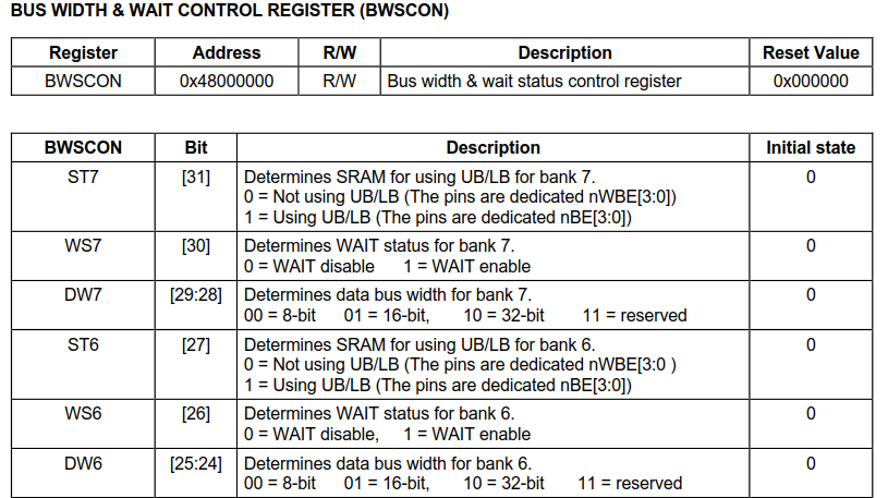 该寄存器我们只需要设置和SDRAM有关的bank7和bank6,我的开发板的SDRAM是连接到bank6的,我们需要配置bank6相关位,不过一般我们bank6和bank7都设置为一样(我记得两者好像是有共用什么来着,不记得了,需要查手册再去看才能想起),ST6位里的UB/LB一般是用于SRAM的,我用的是SDRAM,配置为0;WS6配置为disable,因为我的开发板扩展了两片16位的SDRAM,相当于一片32位的SDRAM,DW6选择32bit。bank7配置和bank6一样,所以我们配置BWSCON = 0X22000000;