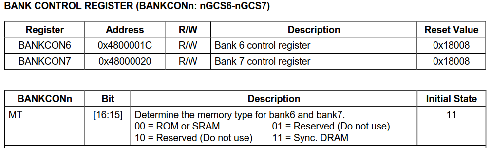 通过查阅手册我们知道,2440有8个可以用来扩展内存的BANK,其中第6和第7还可用来扩展SDRAM