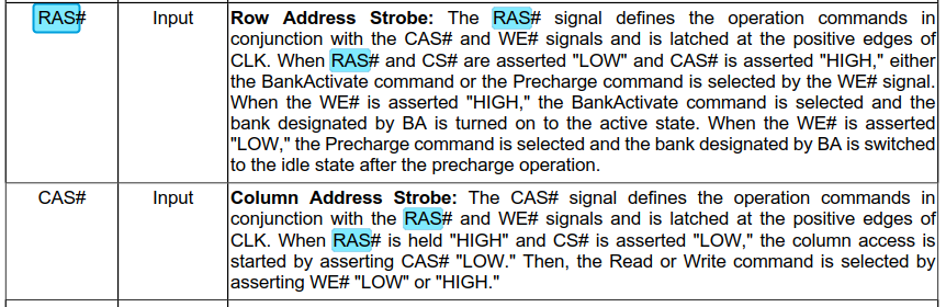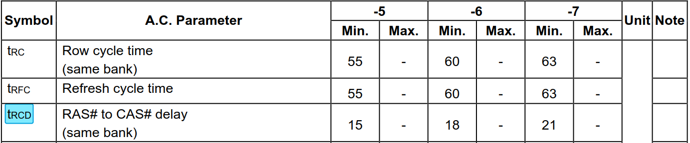 对于MT,因为我们用的是SDRAM,所以配置为11;配置为SDRAM模式后,还需要配置Trcd和SCAN,Trcd是RAS(行地址发出时间)到CAS(列地址发出时间)的时间间隔,我们可以直接在我们的SDRAM芯片手册里查找一下Trcd,结果如下图