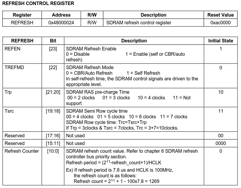 因为SDRAM需要不断地刷新才能保存住里面的数据,所以REFEN必须使能;TREFMD配置为自动模式;Trp直接在我们的SDRAM芯片手册里查找得知-6型号的芯片为18,所以配置为2个clocks,Tsrc在芯片手册里找不到,但我们可以查找Trc,-6型号的Trc为60ns,所以Tsrc等于60-18等于42,我们配置为5个clocks;配置Refresh Counter需要在SDRAM手册里查找Refresh period,我的芯片是64ms/8k,根据公式算出Refresh count等于1269,所以REFRESH配置为0X8404F5。