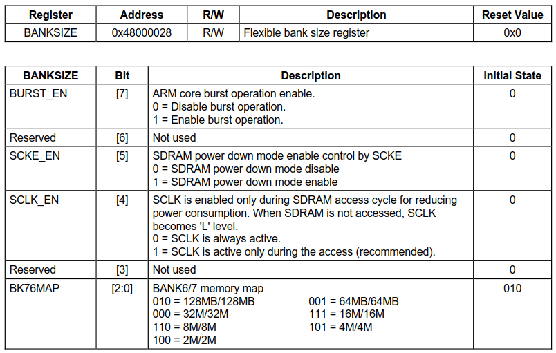 我们使能突发访问(可一次连续访问多个字节)和休眠模式,所以bit5和7都配置为1,bit4采用推荐值1,因为我们相当于扩展了一片64M的SDRAM,所以BK76MAP配置为64MB,所以BANKSIZE配置为0XB1。
