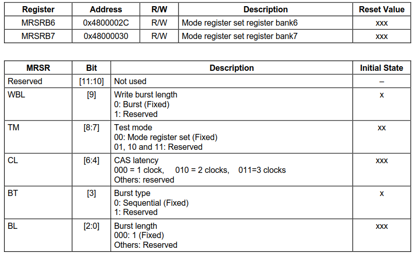 这个寄存器只有CL是可设置的,其他都为Fixed,因为SDRAM这种内存芯片其实性能不是很好,我们在发送完地址后,一般需要等待2或3个时钟周期才有数据返回,CL正是设置这一点的,我们的SDRAM芯片可配置为2或者3,我们配置为2,所以MRSRB6和MRSRB7配置为0X20。