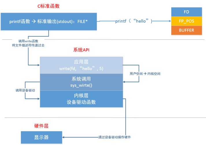 由该图可以看出,C库函数printf标准输出的文件描述符为fd,文件读写指针为FP_POS,I/O缓冲区为BUFFER,其中存储了要输出的内容(hello),这些都保存在FILE结构体中。为了实现将缓冲区的数据送入内核缓冲中,printf函数需要调用write函数,其有三个参数:文件描述符、字符串和字符串长度,从而把文件描述符和输出的内容传递到内核。强调一点:write函数是应用层的函数,处于用户空间,对用户空间进行操作。接着,调用函数sys_write( ),该函数完成一个系统调用,位于内核空间,对内核操作,调用相应的设备驱动程序,属于内核层。最后,设备驱动程序运行,驱动设备完成输出数据到显示器的操作,属于硬件层。这也是由系统调用来完成的。