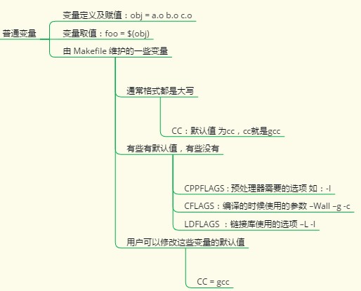makefile中已经定义的一些普通变量(通常格式都是大写,类似环境变量,它们都是普通变量,直接赋值即可,任意类型皆可):CC,其值为gcc或cc(cc就是gcc,完全等价),且用户还可以修改这些值。