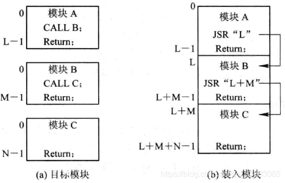 静态链接方式。在装入之前就将所有的目标模块和需要的库文件链接成为一个完整的装入模块(可执行文件.exe),以后不再拆开。每个目标模块都采用的是逻辑地址,即起始地址均为0,因此链接过程中需要做以下修改:对相对地址(程序或指令地址、数据地址)进行修改;对外部调用符号进行修改,如CALLB,表示调用模块B(目标文件B),改为JSR“L”,L为B的首地址。如下: