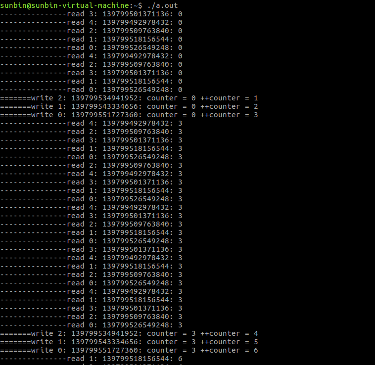 {int t;int i = (int)arg;while (1) {t = counter;usleep(1000);pthread_rwlock_wrlock(&rwlock);printf("=======write %d: %lu: counter = %d ++counter = %d\n", i, pthread_self(), t, ++counter);pthread_rwlock_unlock(&rwlock);usleep(5000);}return NULL;