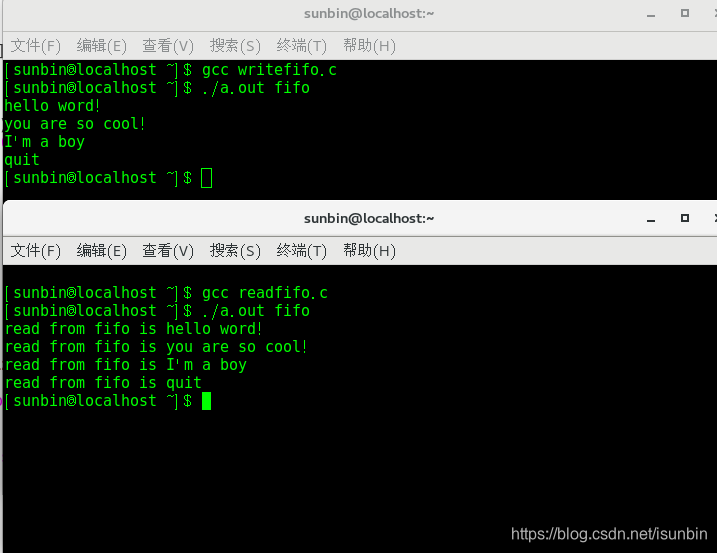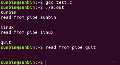 {int pipefd[2];int ret, nwrite, nread;pid_t pid;char writebuf[1024];char readbuf[1024];ret = pipe(pipefd);if (ret == -1){perror("pipe");return -1;}pid = fork();if (pid == -1){perror("fork");return -1;}else if (pid == 0){close(pipefd[1]);while (1){nread = read(pipefd[0], readbuf, sizeof(readbuf));if (nread == -1){perror("read");exit(-1);}printf("read from pipe %s\n", readbuf);if (!strncmp(readbuf, "quit", 4))break;}}if (pid > 0){close(pipefd[0]);while (1){fgets(writebuf, sizeof(writebuf), stdin);nwrite = write(pipefd[1], writebuf, sizeof(writebuf));if (nwrite == -1){perror("write");exit(-1);}if (!strncmp(writebuf, "quit", 4))break;}}