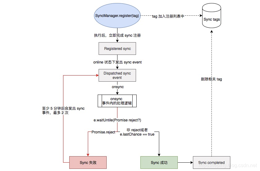 从注册一个 Sync tag 到这个 Sync tag 完成,会经历三个阶段: