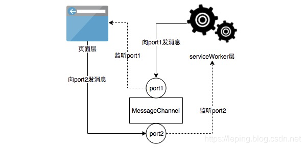 // 页面层环境if(navigator.serviceWorker.controller) {var c = new MessageChannel();c.port1.onmessage = e => {// 收到传给 port1 的消息}// 向 port2 发送消息navigator.serviceWorker.controller.postMessage('消息', [c.port2])