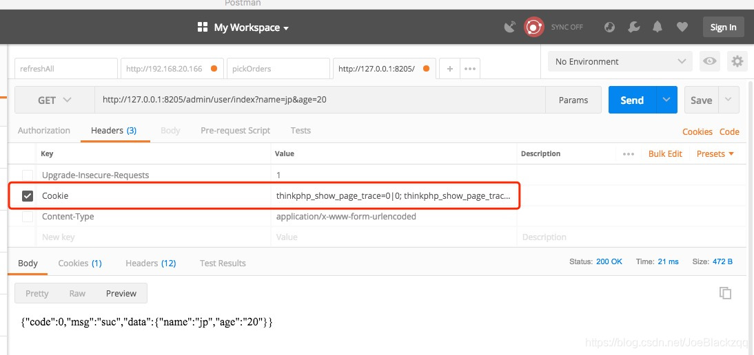 看了下请求头中,感觉最有用的可能就是这个Cookie了,所以尝试将它添加到postman的请求头中
