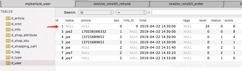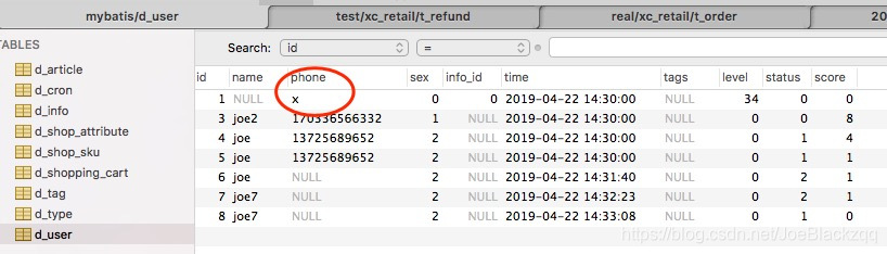 2. 当UserInfoMap中有字段不为NULL的时候,getUserInfo返回的结果才不为null(前提查询的记录存在),如d_user表id=1中,为phone添加值"x",如下图: