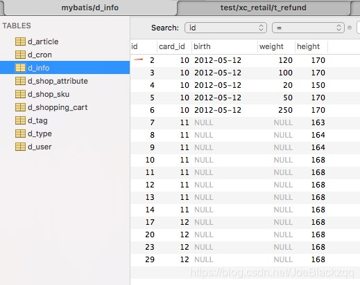 2019-06-26 11:01:20.965 DEBUG 95861 --- [ main] c.z.m.d.m.InfoMapper.selectByPrimaryKey : ====> Preparing: select id, card_id, birth, weight, height from d_info where id = ?