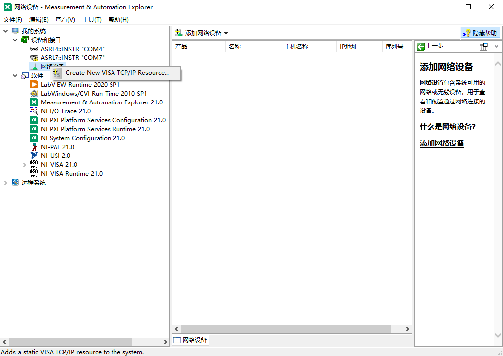 打开安装的NI MAX软件,设备和接口中添加一个网络设备。