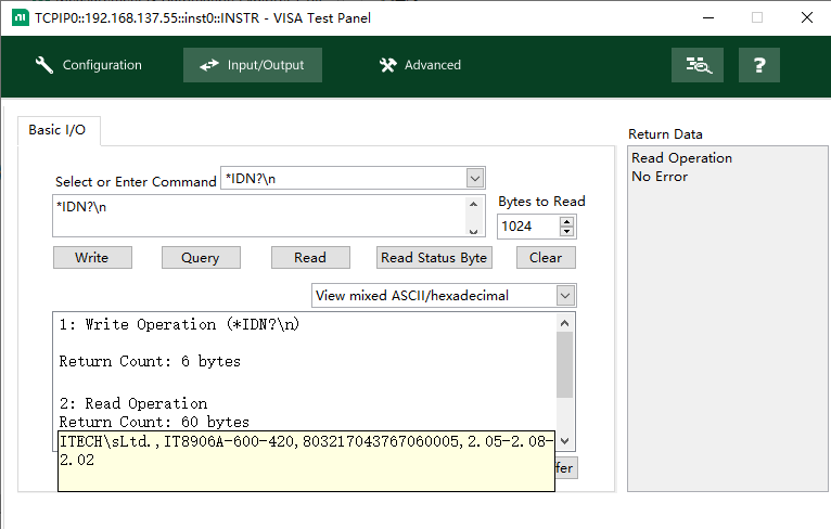 此时可以打开VISA测试面板,在Input/Output栏测试SCPI指令。