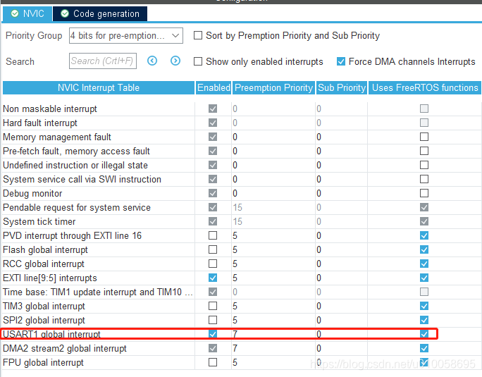 FreeRTOS设置的中断管理范围为5~15,USART中断应该在该范围内,此处设计为7。