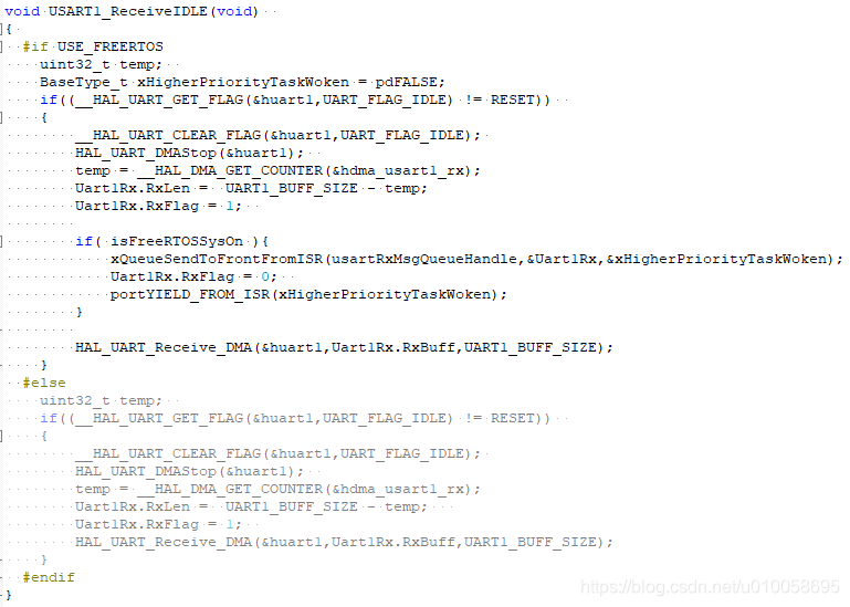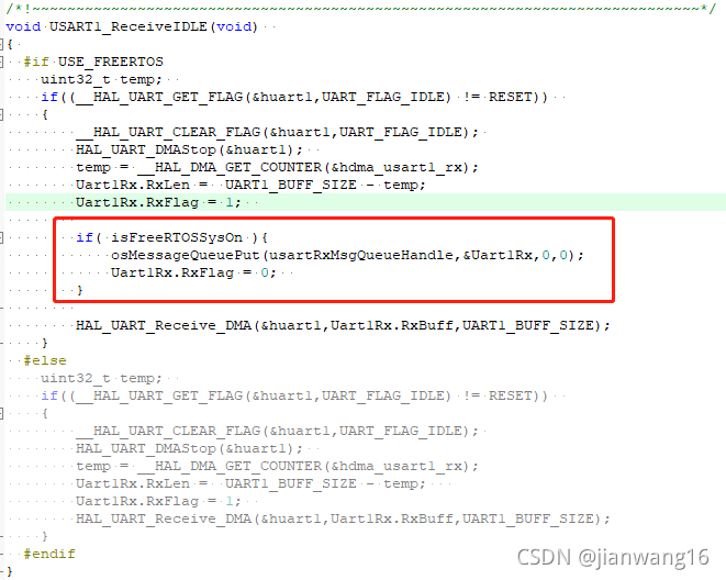 USART+DMA空闲中断发生后,将接收到的DMA消息用消息队列发出去xQueueSendToFrontFromISR,FreeRTOS创建一个独立的任务一直等待接受消息队列。