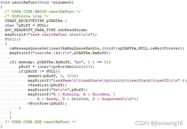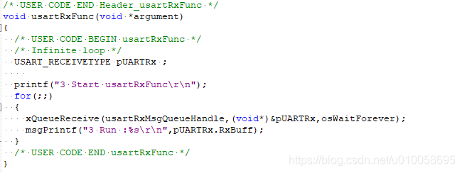 最后在usartRxFunc任务函数入口编写串口数据业务处理逻辑,调用xQueueReceive一直阻塞等待。