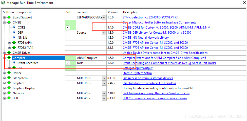1、在Compiler中添加EventRecorder 组件,CMSIS的版本5.4。