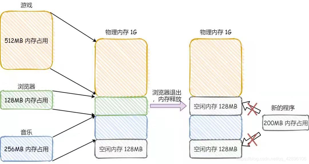 如果这个 256 MB 内存不是连续的 被分成两个128 MB 内存,这样就会导致无法打开一个 200 MB 内存的程序。