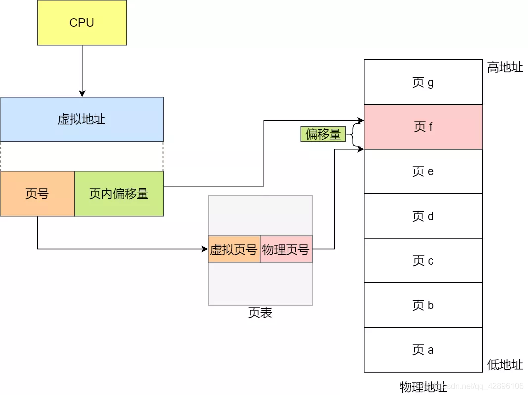 在分页的机制下,虚拟地址分为两部分,页号和页内偏移。页号作为页表的索引,页表包含虚拟内存页每页所在的物理内存的基地址,这个基地址与页内偏移的组合就形成了物理内存的地址,见下图