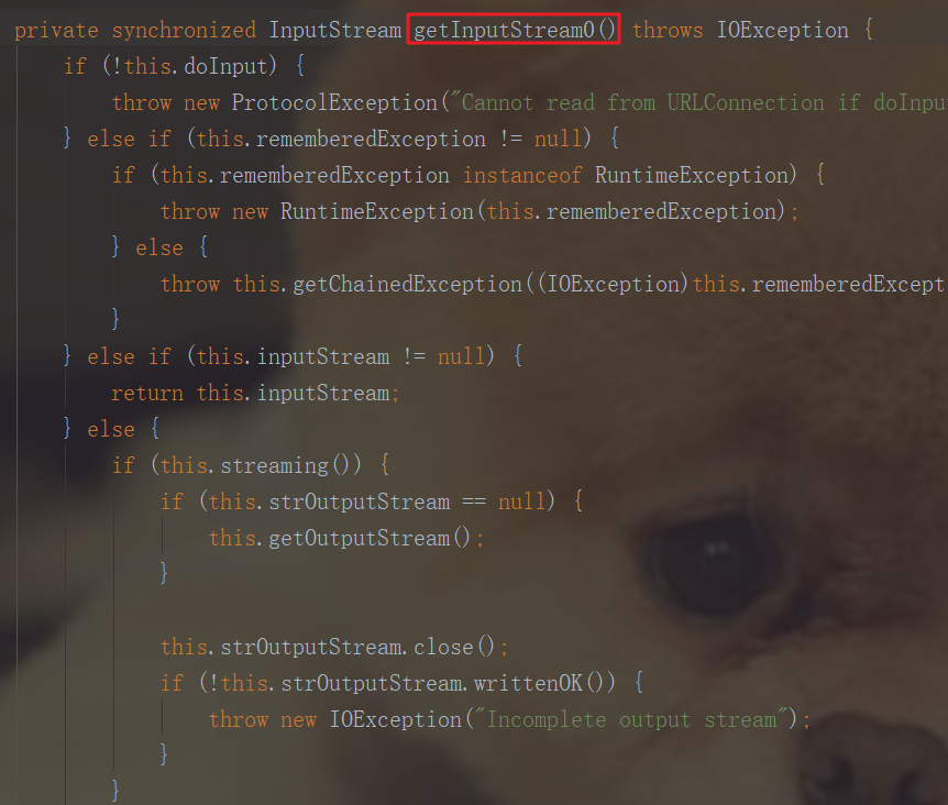 public synchronized InputStream getInputStream() throws IOException {this.connecting = true;SocketPermission var1 = this.URLtoSocketPermission(this.url);if (var1 != null) {try {return (InputStream)AccessController.doPrivilegedWithCombiner(new PrivilegedExceptionAction<InputStream>() {public InputStream run() throws IOException {return HttpURLConnection.this.getInputStream0();}}, (AccessControlContext)null, var1);} catch (PrivilegedActionException var3) {throw (IOException)var3.getException();}} else {return this.getInputStream0();}}getInputStream0方法中