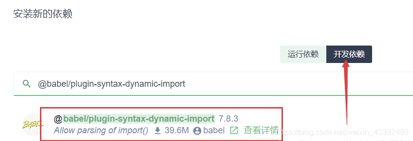 面板,选择开发依赖,输入 @babel/plugin-syntax-dynamic-import