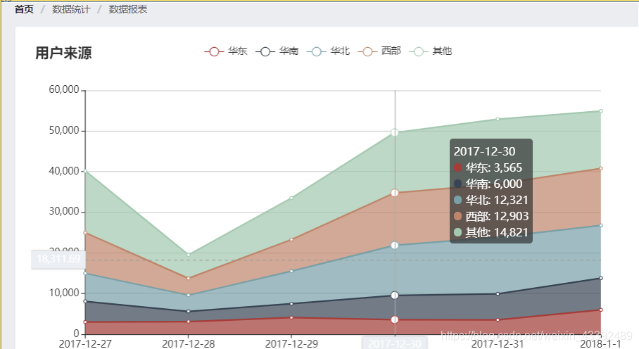 export default {data() {return {/* 需要合并的数据 */options: {title: {text: '用户来源'},tooltip: {trigger: 'axis',axisPointer: {type: 'cross',label: {backgroundColor: '#E9EEF3'}}},grid: {left: '3%',right: '4%',bottom: '3%',containLabel: true},xAxis: [{boundaryGap: false}],yAxis: [{type: 'value'}]}}},created() {},async mounted() {// 3.基于准备好的dom,初始化echarts实例var myChart = echarts.init(document.getElementById('main'))const { data: res } = await this.$http.get('reports/type/1')if (res.meta.status !== 200) {return this.$message.error('获取折线图数据失败!')}// 4.准备数据和配置项(res.data)const result = _.merge(res.data, this.options)// 5.使用刚指定的配置项和数据显示图表。myChart.setOption(result)},computed: {},methods: {}