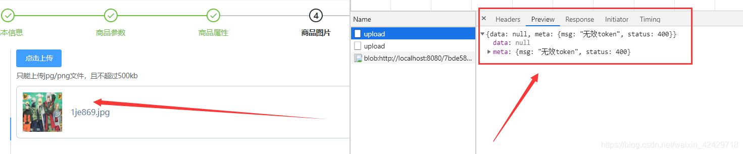 配置如下之后,并不代表就真正上传了,此时,我们打开 Network 查看 Preview ,发现 msg 提示我们 无效 token,状态码为 400 ,这代表并没有上传成功。