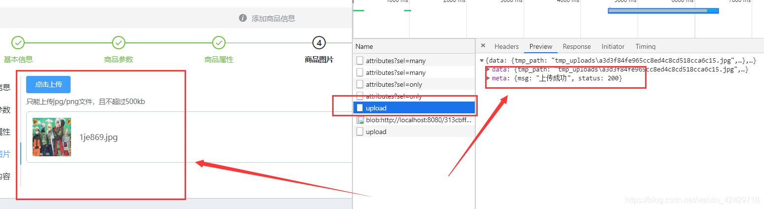 操作完成后,可以看到提示消息 msg 显示上传成功,并且此时状态码也变为了 200。