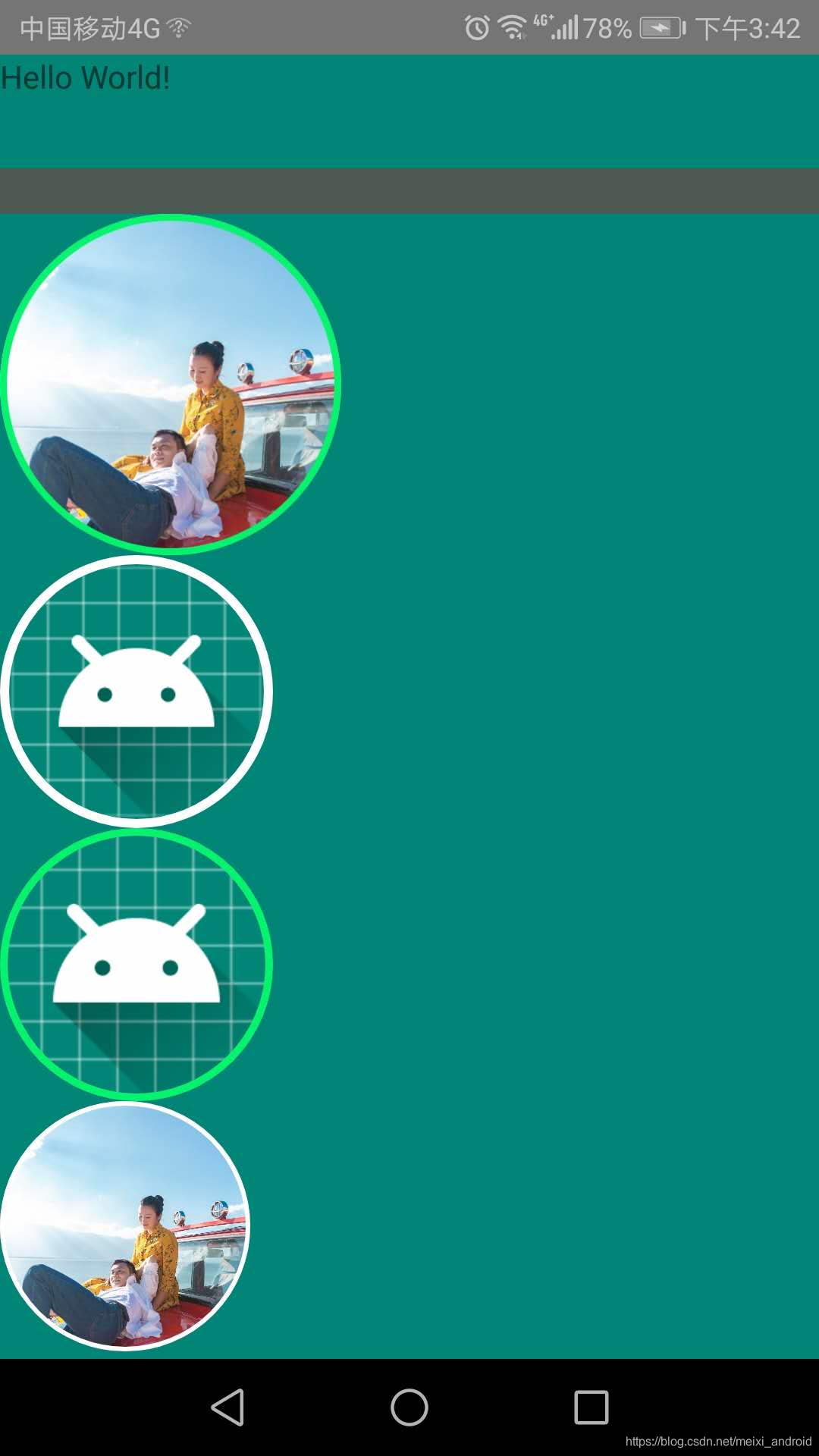 // Log.i("lgq","tp-----"+bitmap.getWidth()+"........"+bitmap.getHeight());//设置矩阵,针对bitmap作缩放处理Matrix matrix = new Matrix();matrix.setScale(mScale, mScale);bitmapShader.setLocalMatrix(matrix);paint.setShader(bitmapShader);paint.setFlags(Paint.ANTI_ALIAS_FLAG);//这里开始画一个圆形,并对paint设置的BitmapShader中的bitmap进行裁剪处理canvas.drawCircle(radius, radius, radius, paint);// 得到自定义视图的高度int viewHeight;// 得到自定义视图的宽度int viewWidth;// 得到自定义视图的X轴中心点int viewCenterX;// 得到自定义视图的Y轴中心点int viewCenterY;viewHeight = getMeasuredHeight();viewWidth = getMeasuredWidth();viewCenterX = viewWidth / 2;viewCenterY = viewHeight / 2;Paint mPaint = new Paint();mPaint.setColor(getResources().getColor(R.color.green));//14549BmPaint.setStrokeWidth(10);mPaint.setAntiAlias(true);mPaint.setFlags(Paint.ANTI_ALIAS_FLAG);mPaint.setStyle(Paint.Style.STROKE);RectF rectF = new RectF();rectF.left = viewCenterX - radius+5;rectF.top = viewCenterY - radius+5;rectF.right = viewCenterX + radius-5;rectF.bottom = viewCenterY + radius-5;canvas.drawArc(rectF, 0, 360, false, mPaint);//画边框// canvas.drawPath(path, mPaint);}public static Bitmap drawable2Bitmap(Drawable drawable) {if (drawable instanceof BitmapDrawable) {BitmapDrawable bd = (BitmapDrawable) drawable;return bd.getBitmap();}int w = drawable.getIntrinsicWidth();int h = drawable.getIntrinsicHeight();Bitmap bitmap = Bitmap.createBitmap(w, h, Bitmap.Config.ARGB_8888);Canvas canvas = new Canvas(bitmap);drawable.setBounds(0, 0, w, h);drawable.draw(canvas);return bitmap;}}