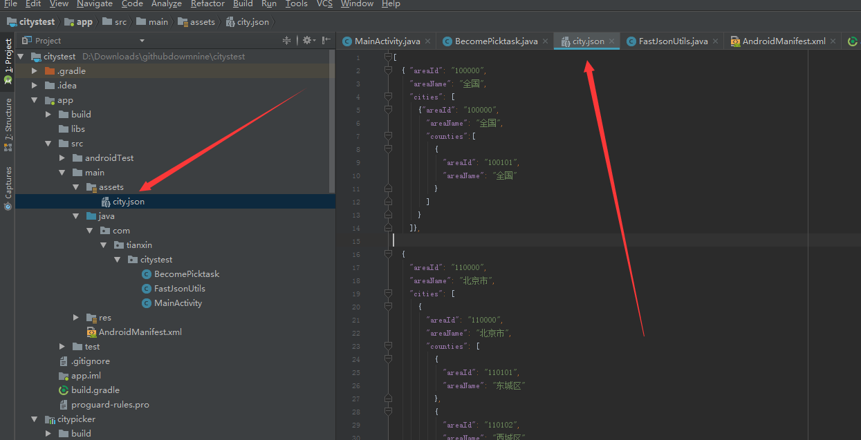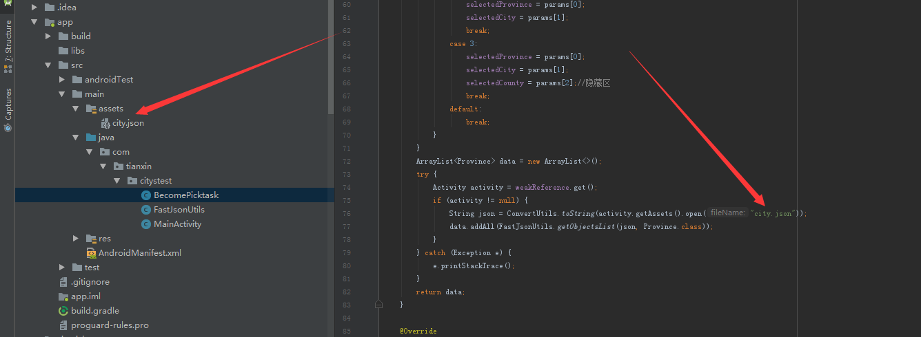 /*** 作者:created by meixi* 邮箱:13164716840@163.com* 日期:2018/12/3 08*/public class BecomePicktask extends AsyncTask<String, Void, ArrayList<Province>> {private WeakReference<Activity> weakReference;private ProgressDialog dialog;private Callback callback;private String selectedProvince = "", selectedCity = "", selectedCounty = "";private boolean hideProvince = false;private boolean hideCounty = false;//隐藏区truepublic BecomePicktask(Activity activity) {weakReference = new WeakReference<>(activity);}public void setHideProvince(boolean hideProvince) {this.hideProvince = hideProvince;}public void setHideCounty(boolean hideCounty) {this.hideCounty = hideCounty;}public void setCallback(Callback callback) {this.callback = callback;}@Overrideprotected void onPreExecute() {Activity activity = weakReference.get();if (activity != null) {dialog = ProgressDialog.show(activity, null, "正在初始化数据...", true, true);}}@Overrideprotected ArrayList<Province> doInBackground(String... params) {if (params != null) {switch (params.length) {case 1:selectedProvince = params[0];break;case 2:selectedProvince = params[0];selectedCity = params[1];break;case 3:selectedProvince = params[0];selectedCity = params[1];selectedCounty = params[2];//隐藏区break;default:break;}}ArrayList<Province> data = new ArrayList<>();try {Activity activity = weakReference.get();if (activity != null) {String json = ConvertUtils.toString(activity.getAssets().open("city.json"));data.addAll(FastJsonUtils.getObjectsList(json, Province.class));}} catch (Exception e) {e.printStackTrace();}return data;}@Overrideprotected void onPostExecute(ArrayList<Province> result) {dialog.dismiss();if (result.size() > 0) {Activity activity = weakReference.get();if (activity != null) {AddressPicker picker = new AddressPicker(activity, result);picker.setHideProvince(hideProvince);picker.setHideCounty(hideCounty);if (hideCounty) {picker.setColumnWeight(1 / 3.0, 2 / 3.0);//将屏幕分为3份,省级和地级的比例为1:2picker.setSelectedItem(selectedProvince, selectedCity);} else {picker.setColumnWeight(2 / 8.0, 3 / 8.0, 3 / 8.0);//省级、地级和县级的比例为2:3:3picker.setSelectedItem(selectedProvince, selectedCity, selectedCounty);}