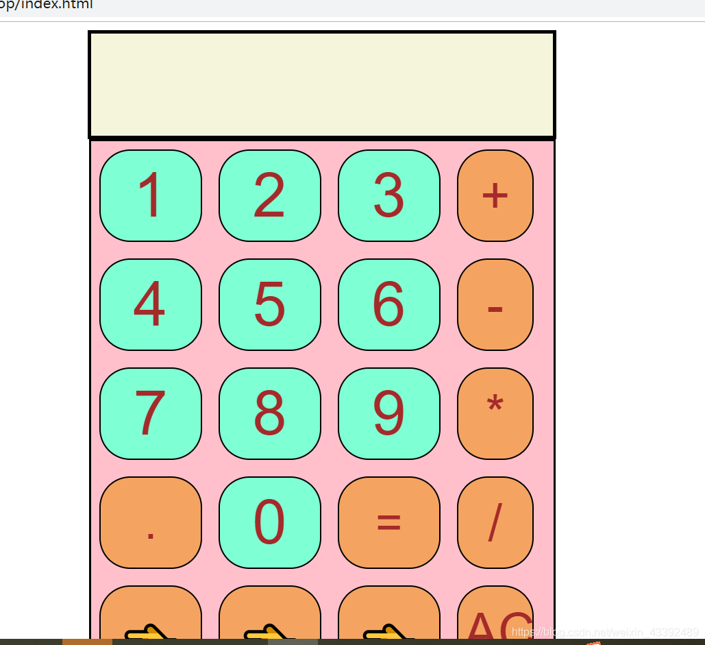 </head><body><center><div class="a" id="resultInput"></div><div id="b"><button class="c" onclick="printResultInput(this)" value="1">1</button><button class="c" onclick="printResultInput(this)" value="2">2</button><button class="c" onclick="printResultInput(this)" value="3">3</button><button class="d" onclick="printResultInput(this)" value="+">+</button><button class="c" onclick="printResultInput(this)" value="4">4</button><button class="c" onclick="printResultInput(this)" value="5">5</button><button class="c" onclick="printResultInput(this)" value="6">6</button><button class="d" onclick="printResultInput(this)" value="-">-</button><button class="c" onclick="printResultInput(this)" value="7">7</button><button class="c" onclick="printResultInput(this)" value="8">8</button><button class="c" onclick="printResultInput(this)" value="9">9</button><button class="d" onclick="printResultInput(this)" value="*">*</button><button class="e" onclick="printResultInput(this)" value=".">.</button><button class="c" onclick="printResultInput(this)" value="0">0</button><button class="e" onclick="count()">=</button><button class="d" onclick="printResultInput(this)" value="/">/</button><button class="e" onclick="tuige()">👈</button><button class="e" onclick="tuige()">👈</button><button class="e" onclick="tuige()">👈 </button><button class="d" onclick="clearNum()">AC</button> 比努力更可怕的是坚持!</div></center><script type="text/javascript">/*printResultInput(this),this可以理解为这个函数在这个按钮的功能 value是赋值*//*将点击的按钮值显示在resultInput上*/function printResultInput(l) { /*??????????????????????????????????????????????????*/document.getElementById("resultInput").innerHTML += l.value;}/* 四则运算方法 */function count() {var countText = document.getElementById("resultInput").innerHTML;var operator, result;if (countText.indexOf("+") !== -1)/*indexOf() 可以显示()里的元素的位置,显示的的是数字。indexOf() 方法对大小写敏感!注释:如果要检索的字符串值没有出现,则该方法返回 -1。。。。。。。在这里用indexof搜索,如果找到了indexof就会是