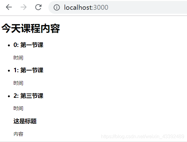 import ReactDOM from 'react-dom';class Welcome extends React.Component {constructor(props) {super(props)this.state = {list: [{title: "第一节课",content: '时间'}, {title: "第一节课",content: '时间'}, {title: "第三节课",content: '时间'}, ]}}render() {/* let listArr = [];for (let i = 0; i < this.state.list.length; i++) {let item = ( <li ><h3 > { this.state.list[i].title } </h3> <p > { this.state.list[i].content } </p> < /li >)listArr.push(item)} */let listArr = this.state.list.map((item, index) => {return ( <li key = "index" ><h3 > { index }: { item.title } </h3> <p > { item.content } < /p> < /li >)})console.log(listArr)return ( <div ><h1 >今天课程内容 </h1> <ul ><li > { listArr } <h3 >这是标题 </h3> <p > 内容 < /p> < /li > </ul> < /div > )}