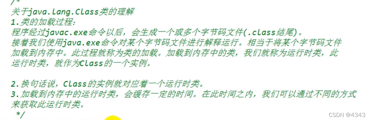 // 方式一:调用运行时类的属性: .classClass clazz = person.class;System.out.println(clazz);// 方式2:通过运行时类的对象person p1 = new person();Class<? extends person> clazz2 = p1.getClass();System.out.println(clazz2);// 方式3:调用Class的静态方法:forName(String classPath)Class clazz3 =Class.forName("JavaReflcet.person");System.out.println(clazz3);// 方式4:使用类的加载器:ClassLoaderClassLoader classLoader = ReflactionTest.class.getClassLoader();Class<?> clazz4 = classLoader.loadClass("JavaReflcet.person");System.out.println(clazz4);}