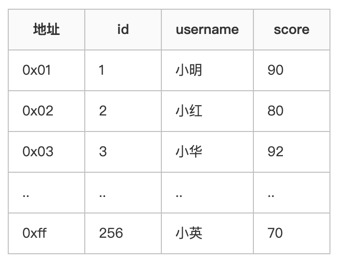 第一列的地址表示该行数据在磁盘中的物理地址,后面三列表示数据库表的真实数据,其中id是主键,建立了聚集索引