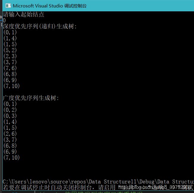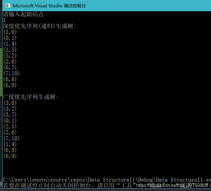 int main() { AdjGraph *G=new AdjGraph; int A[MAXV][MAXV] = { {0,1,1,1,0,0,0,0,0,0,0},{1,0,0,0,1,1,0,0,0,0,0}, {1,0,0,1,0,1,1,0,0,0,0},{1,0,1,0,0,0,0,1,0,0,0}, {0,1,0,0,0,0,0,0,0,0,0},{0,1,1,0,0,0,0,0,0,0,0}, {0,0,1,0,0,0,0,1,1,1,0},{0,0,0,1,0,0,1,0,0,0,1}, {0,0,0,0,0,0,1,0,0,0,0},{0,0,0,0,0,0,1,0,0,0,0}, {0,0,0,0,0,0,0,1,0,0,0} } ; int n = 11, e = 12; CreateAdj(G, A, n, e); //建立《教程》中图8.1(a)的邻接表 //printf("图G的邻接表:\n"); //DispAdj(G); //输出邻接表G cout << "请输入起始结点" << endl; int a; cin >> a; printf("深度优先序列(递归)生成树:"); printf("\n"); DFS(G, a); printf("\n"); printf("广度优先序列生成树:"); printf("\n"); BFS(G, a); printf("\n"); DestroyAdj(G); //销毁邻接表 return 1; }