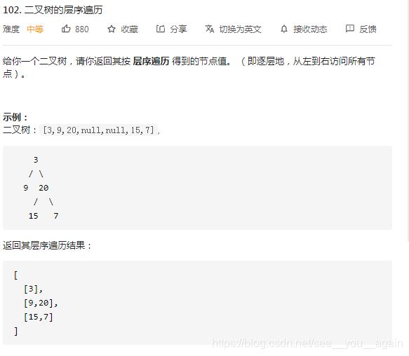 class Solution {public List<List<Integer>> levelOrder(TreeNode root) {List<List<Integer>> res = new ArrayList<List<Integer>>();Queue<TreeNode> queue = new ArrayDeque<>();if(root != null){queue.add(root);}while(!queue.isEmpty()){int n = queue.size();List<Integer> level = new ArrayList<>();for (int i = 0; i < n; i++) { TreeNode node = queue.poll();level.add(node.val);if (node.left != null) {queue.add(node.left);}if (node.right != null) {queue.add(node.right);}}res.add(level);}return res;}