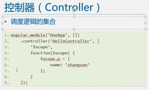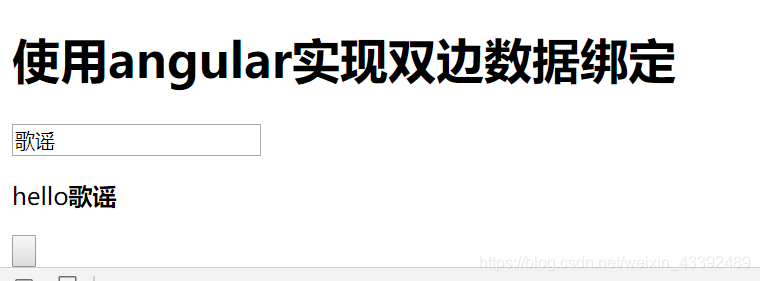 <!-- 需要angular的代码必须包裹在ng-app的代码中 --><body ng-app="myApp" ng-controller="DemoController"><h1>使用angular实现双边数据绑定</h1><p><input type="text" placeholder="请输入你的姓名" ng-model="user.name"></p><p>hello<strong>{{user.name}}</strong></p><input type="button" ng-click="show()"><script src="./js/Angular.js"></script><!-- 第一个参数是这个模块的名字 第二个参数是模块所依赖的模块 --><script>var app = angular.module('myApp', []);//勇于创建一个控制器//创建一个控制器 属于myApp模块app.controller("DemoController", function($scope) {//当控制器执行会自动执行的函数$scope.user = {};$scope.user.name = "歌谣";$scope.show = function() {console.log($scope.user);}})</script>