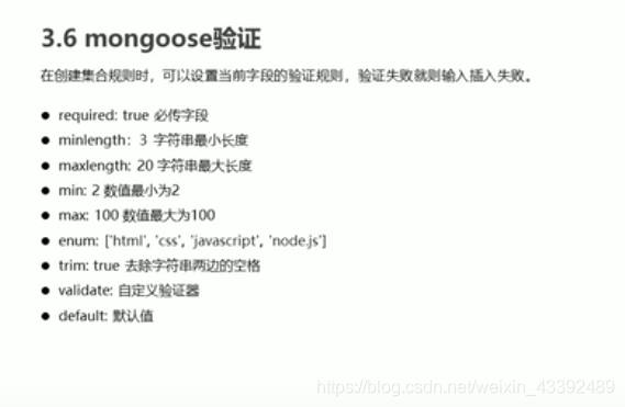 Post.create({ title: 'aa', age: 60, category: 'java', author: '125' }).then(result => console.log(result)).catch(error => {//获取错误信息对象const err = error.errors;//循环错误对象for (var attr in err) {console.log(err[attr]['message'])}});//不允许有空格trim: true},age: {type: Number,//数字得最小范围min: 18,//数字得最大范围max: 100},publishDate: {type: Date,default: Date.now},category: {type: String,enum: ['html', 'css', 'javascript']},author: {type: String,validate: {validator: v => {//true 验证成功//false验证失败v.length>4return v && v.length > 4},//自定义错误信息message: '传入得值不符合规则'}}