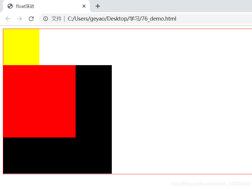 <head><meta charset="UTF-8"><meta name="viewport" content="width=device-width, initial-scale=1.0"><meta http-equiv="X-UA-Compatible" content="ie=edge"><title>float浮动</title><style>body{border:1px solid red}#box1{width: 100px;height: 100px;background: yellow;}#box2{width: 200px;height: 200px;background: red;float: left;}#box3{width: 300px;height: 300px;background: black;}</style>