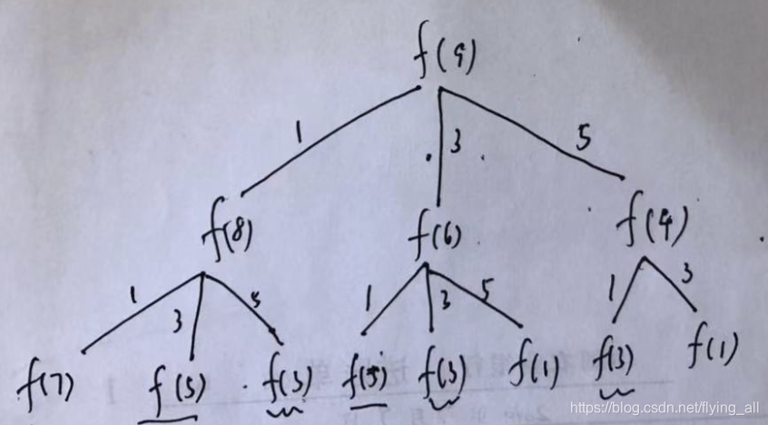 基于上面的回溯画出这样的递归树。树中的每一个节点是一种状态,用f(total)表示。total表示当前方法要支付多少元。(这感觉不像是以前那种状态)我们看到(3). (5)都重复计算了很多次。可以采用备忘录模式,减少计算次数。