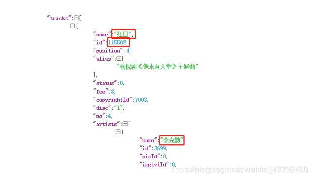 def get_playlist(url): data = [] doc = get_json(url) obj=json.loads(doc) jobs=obj['result']['tracks'] for job in jobs: dic = {} dic['name']=jsonpath.jsonpath(job,'$..name')[0] #歌曲名称 dic['id']=jsonpath.jsonpath(job,'$..id')[0] #歌曲ID data.append(dic) return data